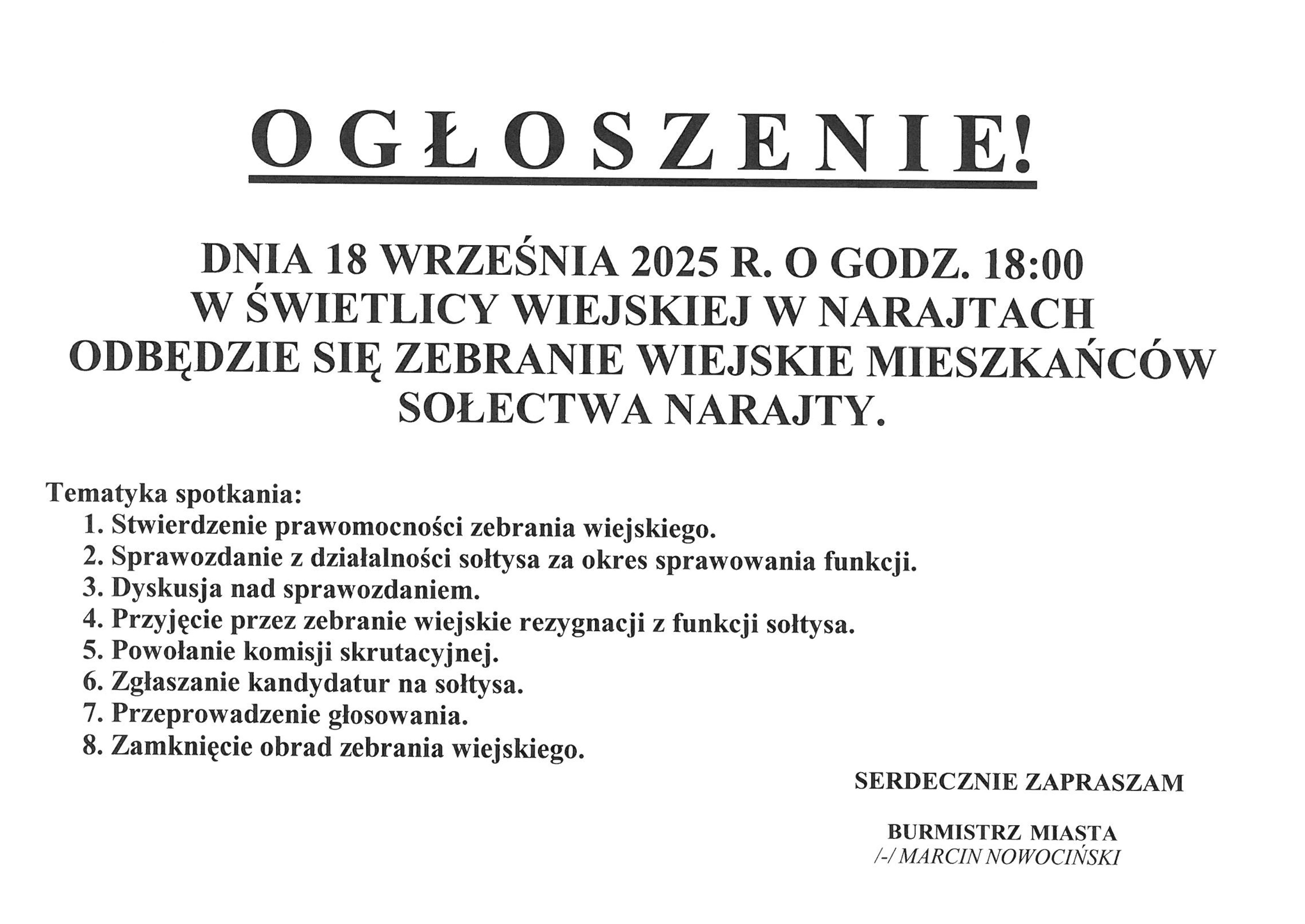 Ogłoszenie o zebraniu wiejskim sołectwa Narajty