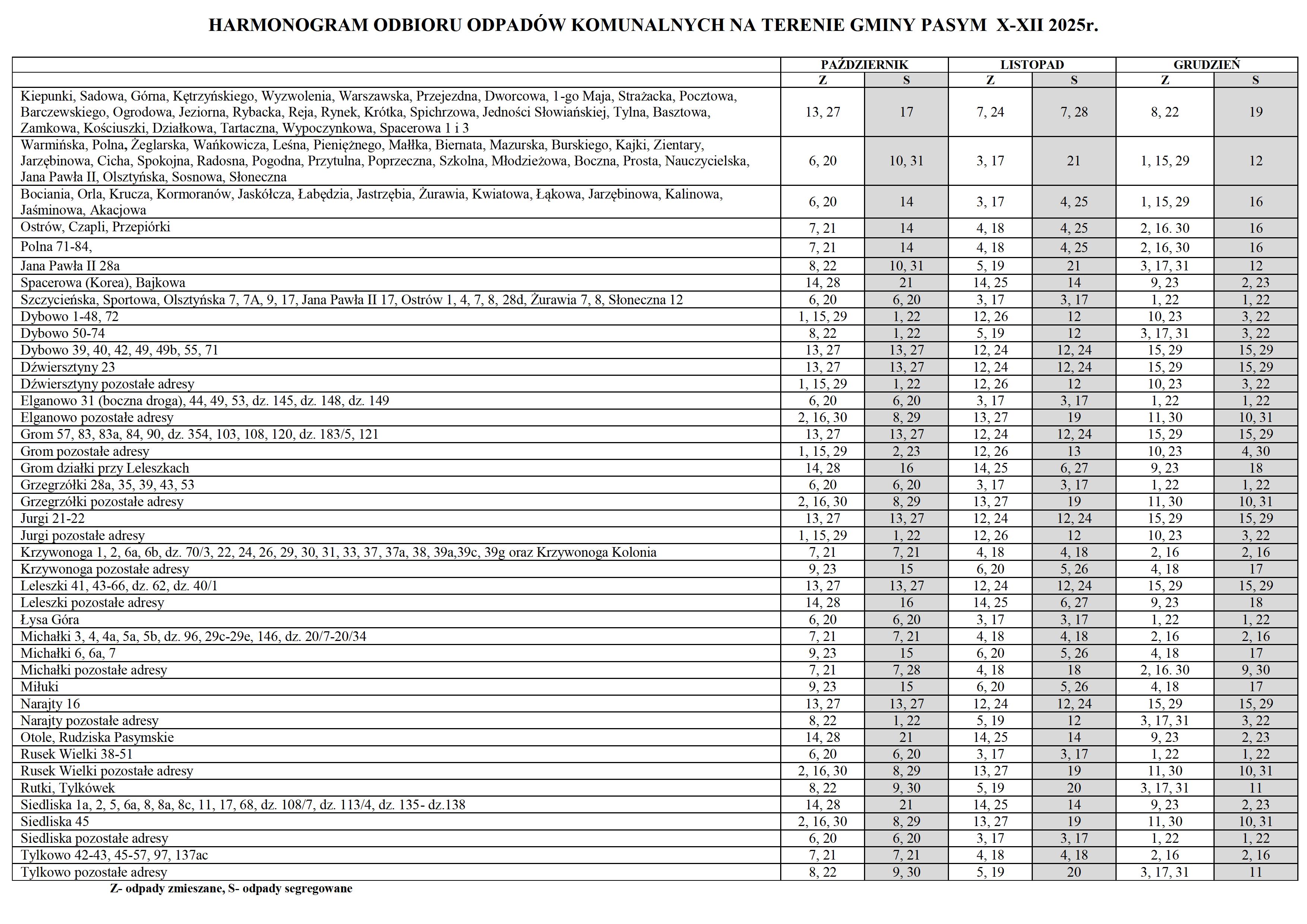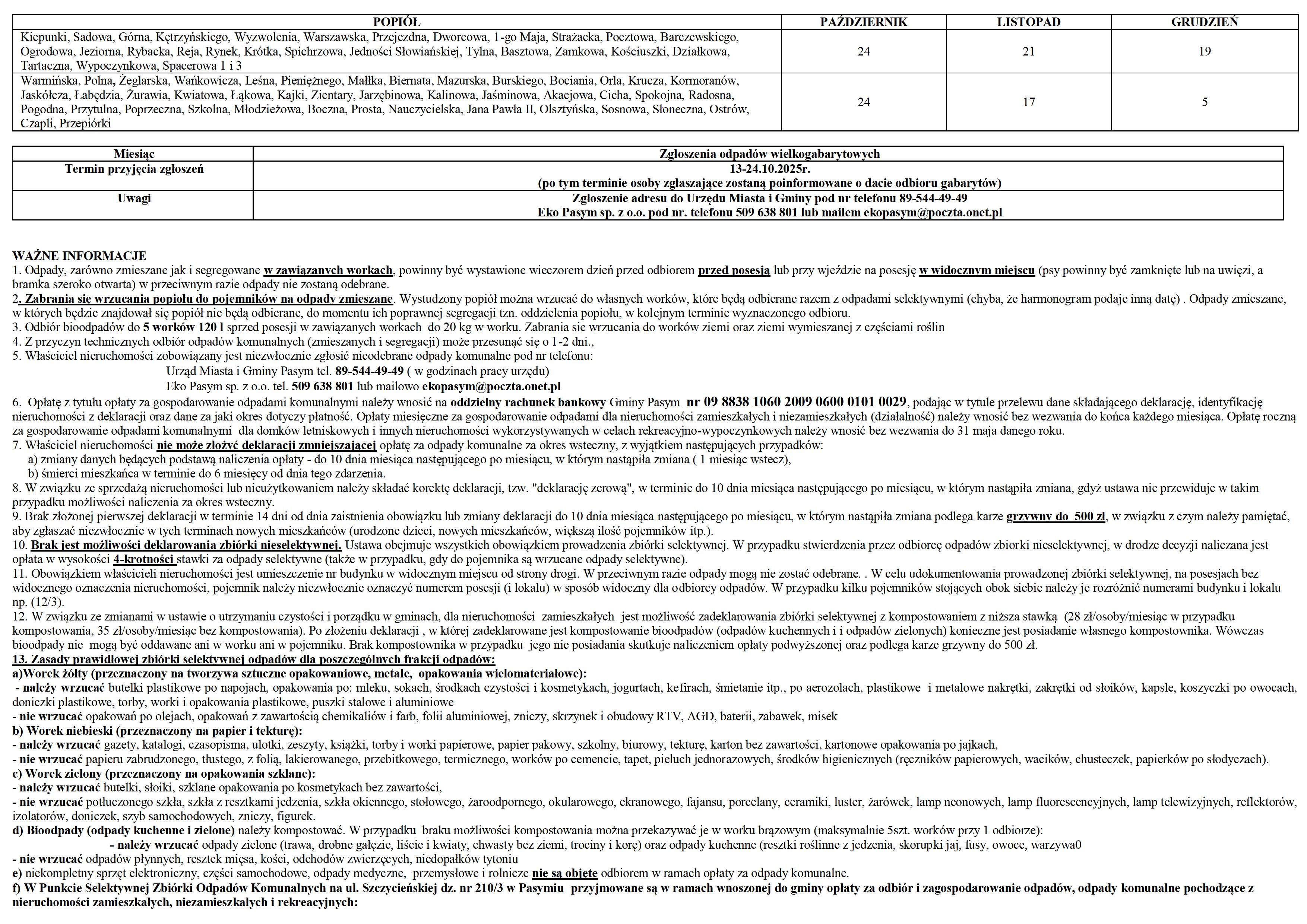Harmonogram odbioru odpadów na terenie gminy Pasym od X 2025 r. do XII 2025 r. 01-10-2025Data publikacji, 01-10-2025, Krzysztof KobylińskiAutor, Krzysztof Kobyliński, 1316Ilość wyświetleń, 1316